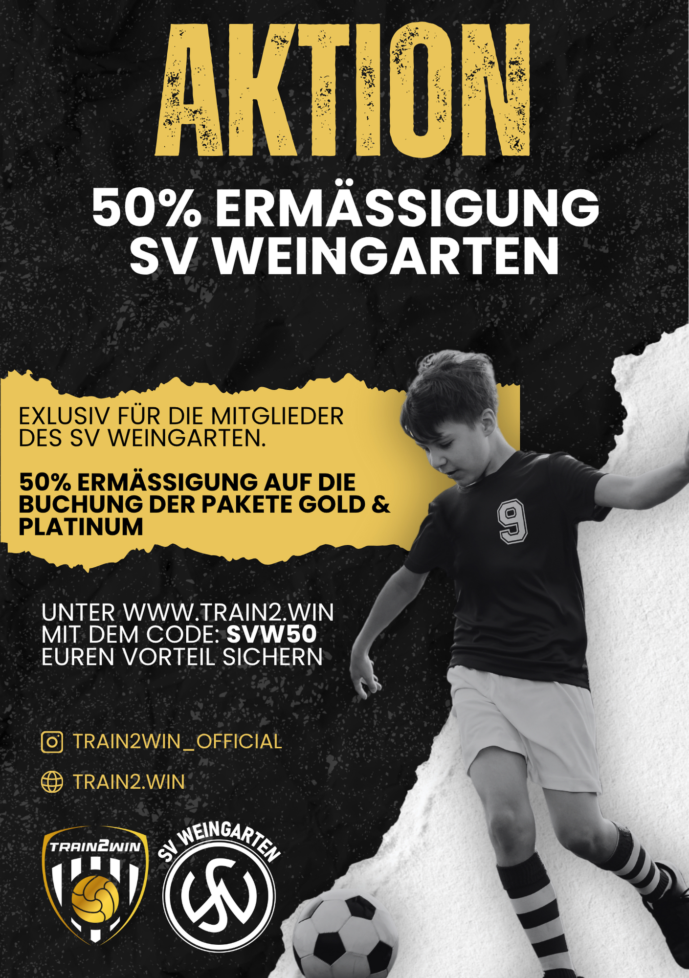 Die Kooperation zwischen dem SV Weingarten und Train2win nimmt immer größere Züge an. Um weiterhin die gemeinsame Zukunft zu gestalten, gewährt Train2win allen Mitgliedern des SV Weingarten 50 % auf die Trainingseinheiten.